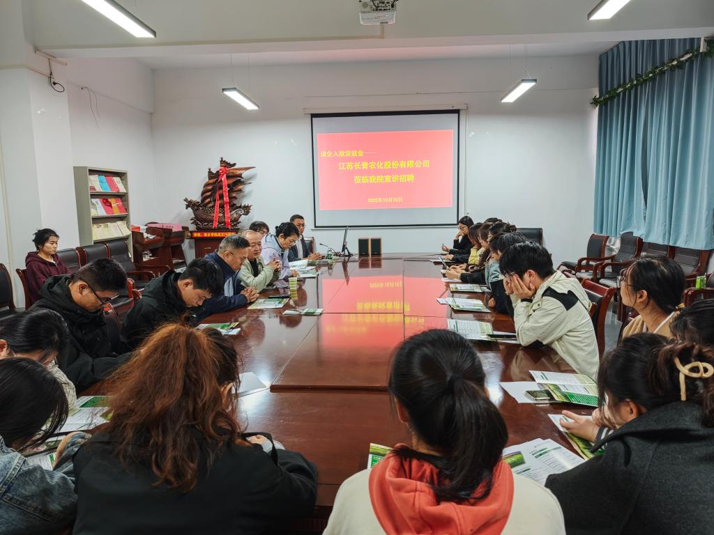 为全面贯彻落实中央、省委关于高校毕业生就业工作的决策部署,拓宽毕业生就业渠道,帮助毕业生早就业、高质量就业,10月10日下午,9428cn太阳集团古天乐“请企入院促就业”系列活动再迎新章,特邀江苏长青农化股份有限公司来我院开展专场招聘宣讲。9428cn太阳集团古天乐党委书记骆云飞、副书记韩爱慧、副院长齐永华、毕业班辅导员及26届求职毕业生齐聚一堂,共话职业未来。