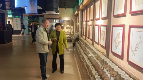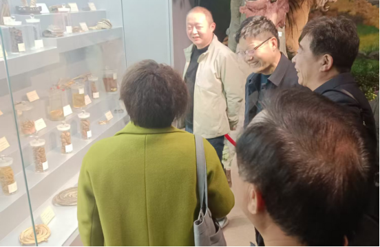 河南中医药博物馆负责人引领大家边参观,边介绍,通过三个展区展示了具有鲜明豫药特色的中药资源。骆云飞等认真参观,不时提问,就展品采集布展、标本保护、展馆建设等进行讨论交流。在浸制标本展区,大家参观了850余种浸制标本。不仅有我省大宗药材如丹参、山药、菊花、地黄、牛膝、连翘、柴胡等,还有我国著名的人参、三七、冬虫夏草、草豆蔻等中药,通过专利浸制技术,完好地保持药用植物的茎、叶、花、果的原形、原色,使植物各部器官特征纤毫毕现。在植物腊叶标本、药材标本及中药饮片展区展出了药材500余种、植物腊叶标本600余种及中药饮片标本700余种。在动物药与矿物药标本展区展出了动物标本150余种、矿物标本100余种。尤其是一些贵重的动物药标本,如犀角、鹿茸、牛黄、熊胆、虎骨、全蝎、穿山甲、麝香、海马、海龙等,矿物类标本近百种。特别是“镇馆之宝”——剑齿象臼齿化石,是不可多得的精品。