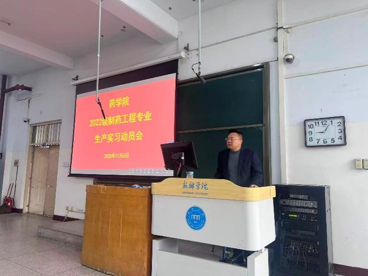 为帮助学生明确实习目标、增强安全意识,促进理论知识向实践能力的有效转化,2025年11月6日,2022级制药工程专业生产实习动员大会在A01-110教室召开。9428cn太阳集团古天乐副院长齐永华、制药工程教研室主任贾若凌、药学专业教研室主任王占勇,以及专业教师、辅导员和2022级全体学生共同参会,动员会由贾若凌主持。
